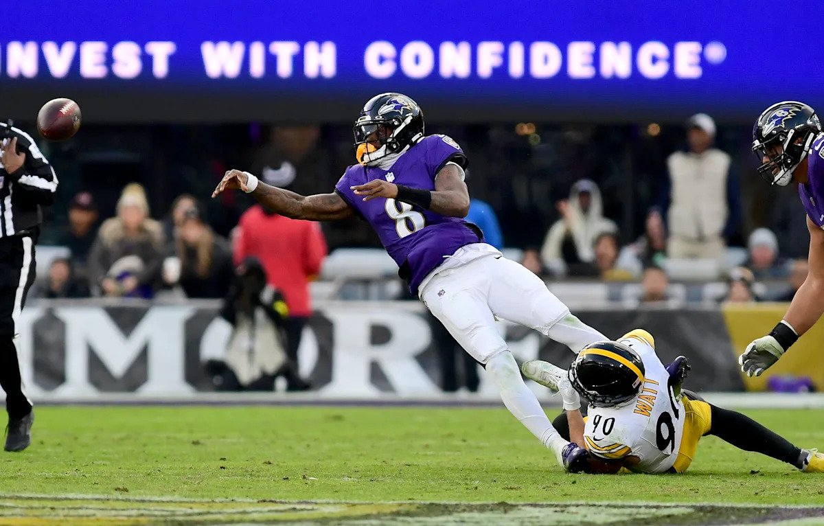 El mariscal de campo de los Ravens, Lamar Jackson (8), lanza un pase mientras el apoyador de los Steelers, TJ Watt (90), lo arrastra al suelo en la derrota del domingo ante Baltimore. (Foto de Randy Litzinger/Icon Sportswire vía Getty Images)