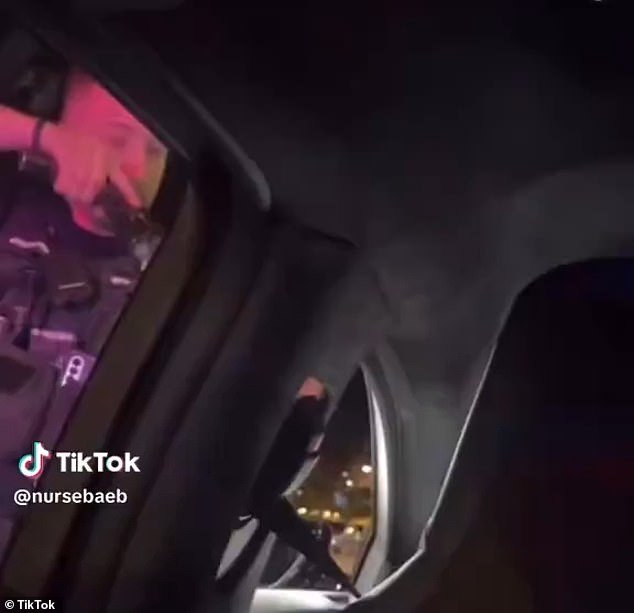 Un oficial tira su arma en Crawford, que se sienta en el asiento del conductor del vehículo