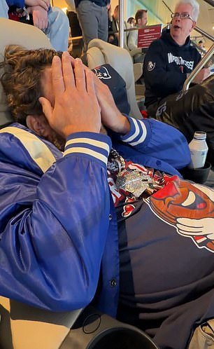 Un Portnoy desamparado se sentó en silencio y simplemente miró fijamente el campo, viendo cómo se desvanecía la perspectiva del séptimo Super Bowl de los Patriots.