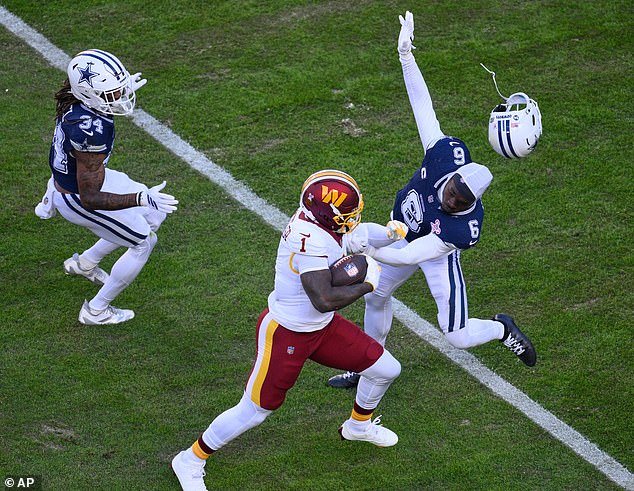 El safety de los Cowboys, Donovan Wilson, perdió su casco después de una brutal colisión en el campo con la estrella de los Commanders, Deebo Samuel.