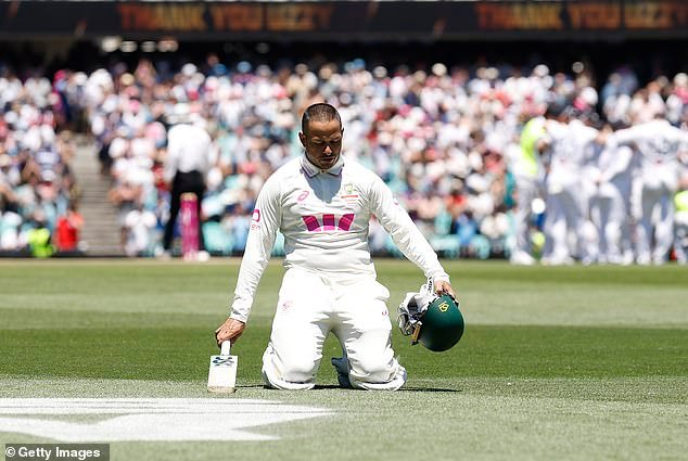 Su esposa Rachel, entre lágrimas, observó desde las gradas cómo Khawaja se arrodillaba en el sagrado césped de Sydney y besaba los jardines antes de abandonar el campo del SCG por última vez.