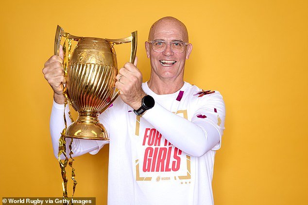 El entrenador en jefe inglés John Mitchell celebra el campeonato mundial de rugby de la gloria final de las mujeres