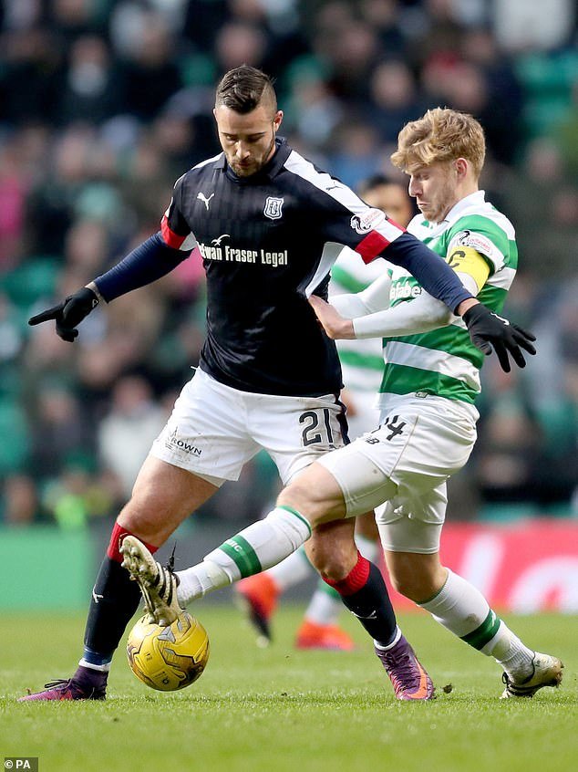 Marcus Haber, del Dundee, y Stuart Armstrong, del Celtic, se enfrentan en suelo escocés en 2016