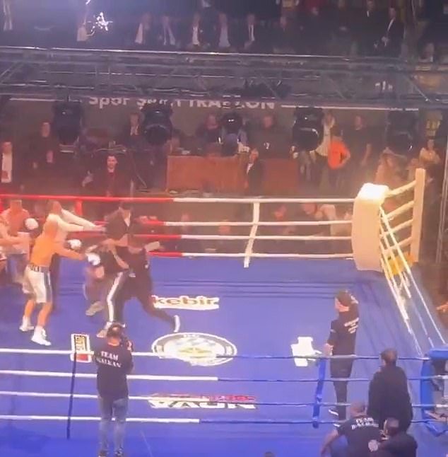 Varias personas de los grupos ruso y turco comenzaron a subir al ring antes de que se inundara de cuerpos.