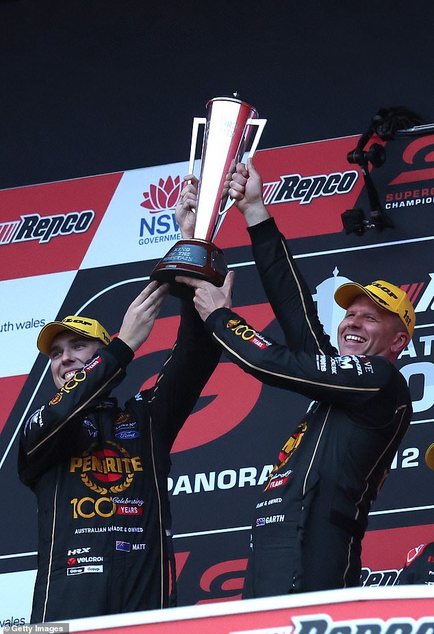 Matt Payne (izquierda) y Garth Tander celebran después de completar una caótica Bathurst 1000, que pasará a la historia como uno de los clásicos de todos los tiempos de Mount Panorama.