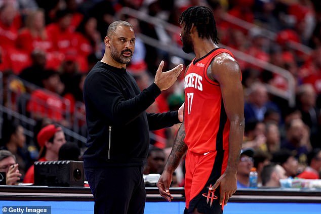 El entrenador en jefe de los Houston Rockets, Ime Udoka, habla con el delantero Tari Eason