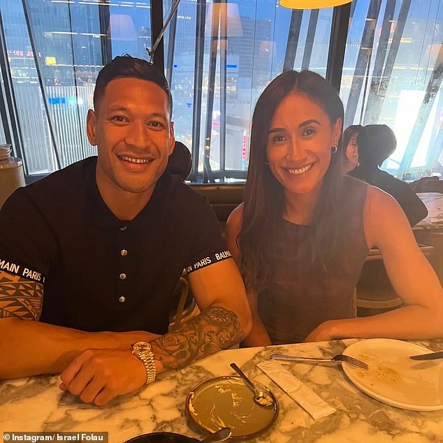Israel Folau hizo una aparición sorpresa en un campo de entrenamiento de los Wallabies en Japón (en la foto con su esposa María)