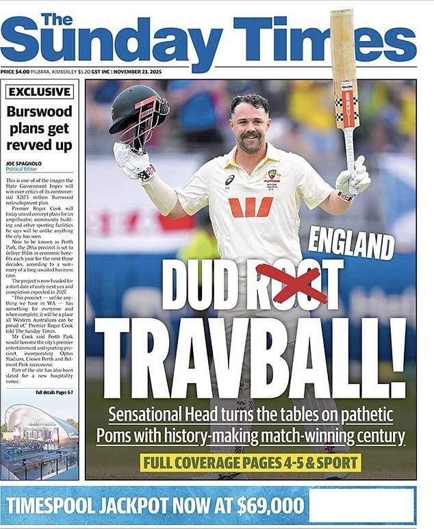 La edición dominical de Australia Occidental, The Sunday Times, eligió publicar una foto de Travis Head celebrando su sensacional centenario el sábado por la tarde, pero también atacó a England y Root.