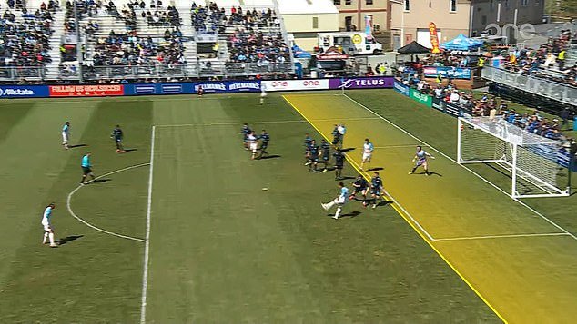 La nueva regla de fuera de juego diurno de Arsene Wenger se utilizó por primera vez el sábado cuando Alejandro Díaz (segundo en pantalla con la camiseta celeste) anotó para el Pacific FC en Canadá.