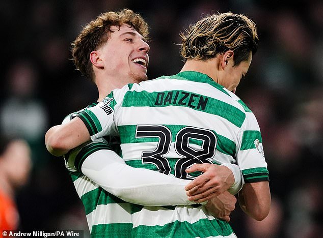 Arne Engels sonríe mientras se lleva a su compañero goleador del Celtic Daizen Maeda a Parkhead