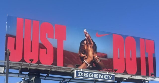 Varios carteles patrocinados por Nike están apareciendo por la ciudad con la corredora de primer año de 800 metros de Long Beach Poly, Laila Kirk, dos veces campeona nacional de la AAU.