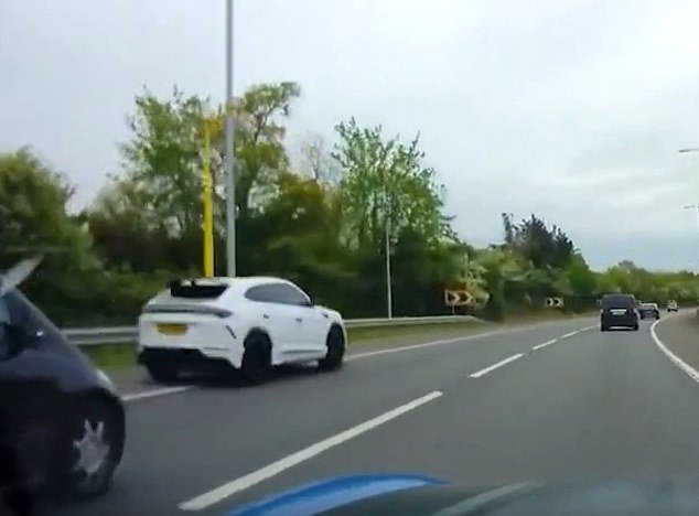 Se ve al hombre de £ 75 millones pasando a toda velocidad junto a un vehículo negro antes de acercarse rápidamente a otro, pisar los frenos y rodear al conductor antes de retroceder por los espacios creados.