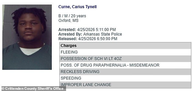 La transferencia de fútbol de Ole Miss, Carius Curne, fue arrestada en Arkansas por posesión de drogas, huida de la policía, conducción imprudente y otros cargos.