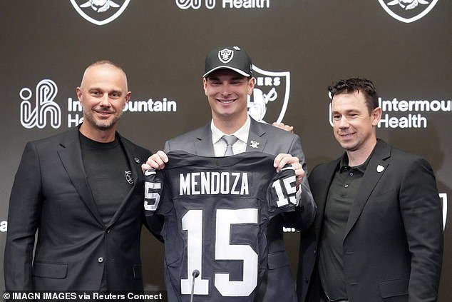 Mendoza, ganador del Trofeo Heisman y campeón nacional, parecía emocionado mientras posaba con su camiseta número 15 junto al entrenador en jefe de los Raiders, Klint Kubiak, y el gerente general, John Spytek.