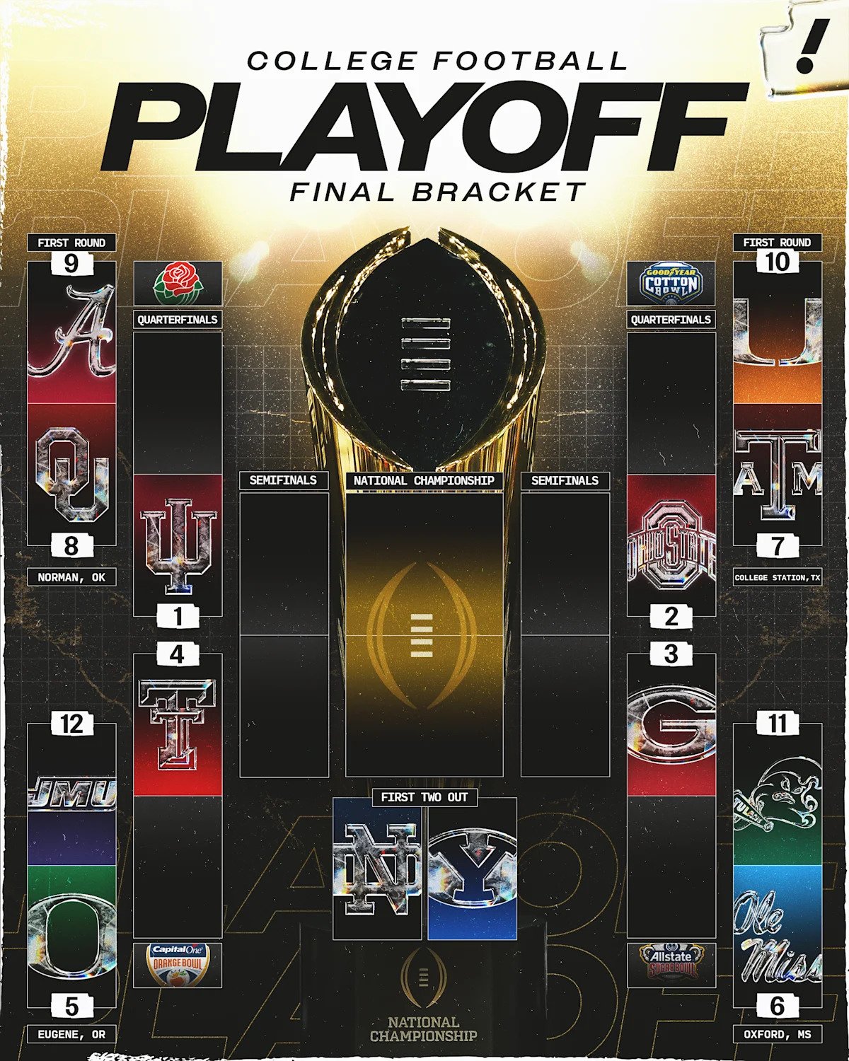 La última liga que intenta adelantarse al carro que se avecina de la NFL: el fútbol universitario, que este sábado disputará dos de los primeros cuatro partidos de sus aún nuevos playoffs contra el poderío de dos grandes rivalidades divisionales de la NFL. Después de que Alabama-Oklahoma (viernes, 8 p. m. ET) y Miami-Texas A&M (sábado, 12 p. m. ET) no tengan oposición, Tulane-Ole Miss (3:30 p. m.) y James Madison-Oregon (7:30 p. m.) tienen la poco envidiable tarea de atraer la atención de los Eagles-Commanders (5:00 p. m.) y Packers-Bears (20:20). jalar.