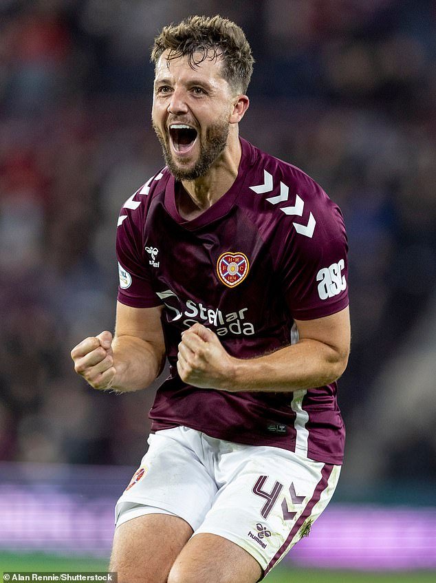Craig Halkett celebra a su ganador del tiempo de jugador para Hearts sobre Hibernian cerca de Tynecastle
