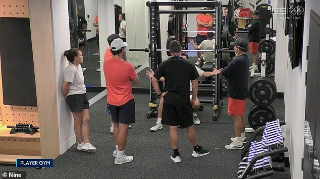 En la foto: Alex de Miñaur (sentado detrás de Lleyton Hewitt con una camiseta negra) gesticula enojado en un momento privado con su equipo que fue captado en video.