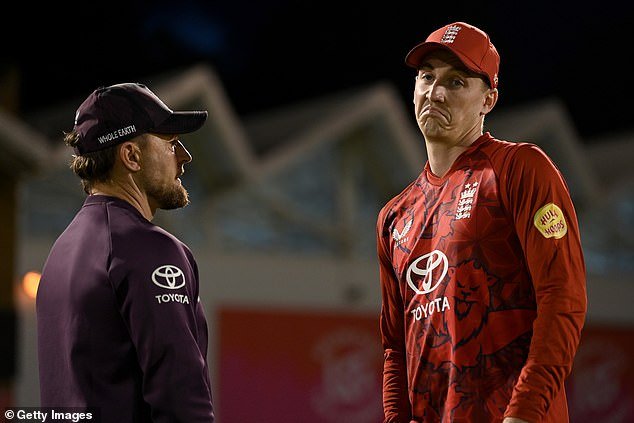 Inglaterra espera saber a finales de esta semana si su partido de la Copa Mundial Twenty20 contra Bangladesh se pospondrá (en la foto: capitán Harry Brook, derecha, con Brendon McCullum)
