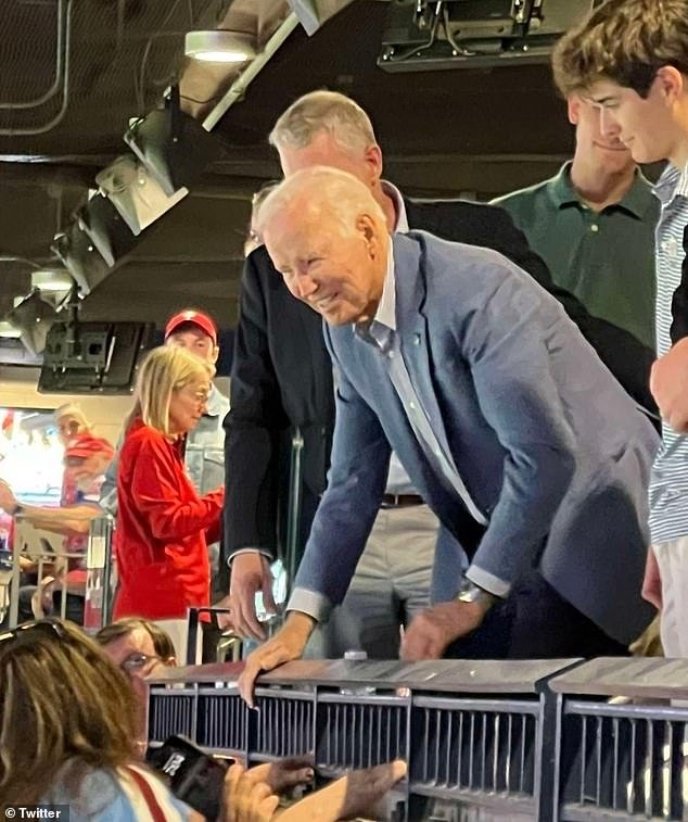 El ex presidente fue visto de pie en fotos que fueron compartidas por los fanáticos de las redes sociales cuando se inclinó sobre la barandilla cuando estaba arraigado a los Filis. El Dr. Biden se sentó a su lado y aplaudió al equipo local.