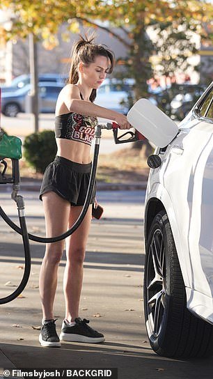 Jordon Hudson, vestido con un diminuto top corto y pantalones cortos, se detiene para cargar gasolina en Carolina del Norte.
