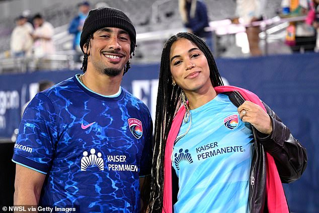 Jordan Love posa para una foto con su ahora esposa Ronika Stone en San Diego