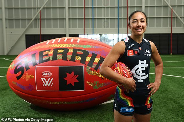 La estrella de la AFLW, Darcy Vescio (en la foto en el lanzamiento de la ronda anual del Orgullo de la AFLW) ha instado a los jugadores a usar disfraces “hirientes” los lunes.