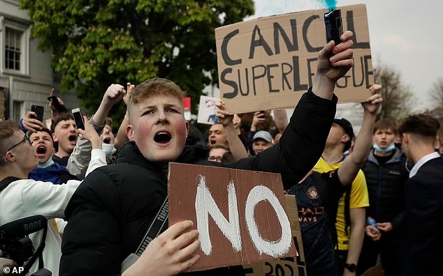 Se ha clavado otro clavo en la Superliga europea tras la salida del Barcelona del proyecto (Imagen: Los aficionados protestan airadamente contra los planes de una liga separatista en 2021)