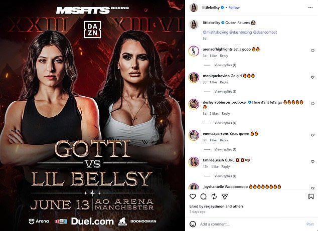 La pelea fue confirmada en la publicación de Instagram de TheFightQueens: “¡13 de junio, @littlebellsy vs #leahgotti el 13 de junio!”