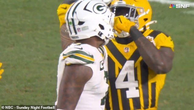 Después de una jugada de segundo intento, el receptor fue sorprendido rasgando visiblemente la máscara del apoyador contrario Quay Walker antes de golpearlo agresivamente en el ojo.