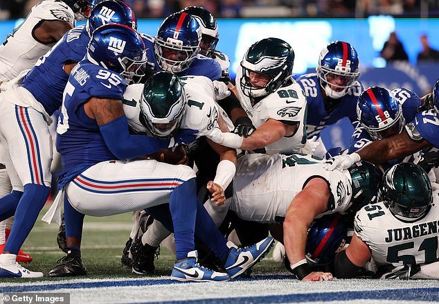Sentados en la yarda 1 de los Giants, los Eagles corrieron el juego cuatro veces seguidas en el segundo cuarto, escapando con una salida en falso, antes de que el mariscal de campo Jalen Hurts finalmente anotara. El punto siguiente le dio a Filadelfia una ventaja de 17-13, que reducirían en la siguiente posesión.