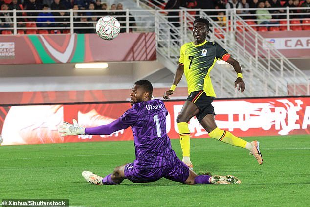 El delantero ugandés Rogers Mato marca para su país ante Nigeria en la Copa Africana de Naciones