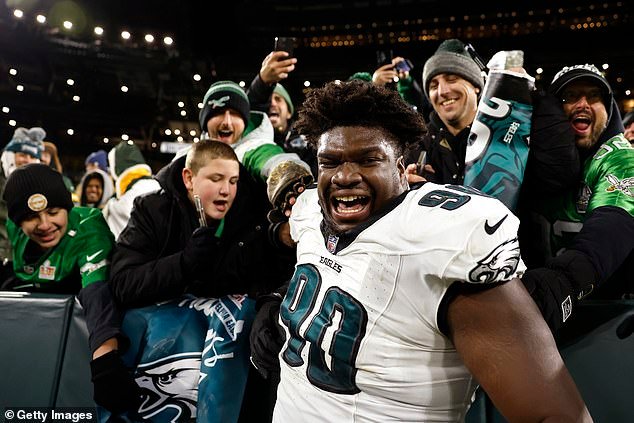 Jordan Davis celebra con los fanáticos de los Philadelphia Eagles después de derrotar a los Packers en noviembre