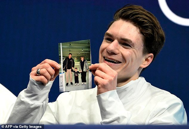 El estadounidense Maxim Naumov sostiene una fotografía de sus difuntos padres después de su debut en los Juegos Olímpicos de Invierno.