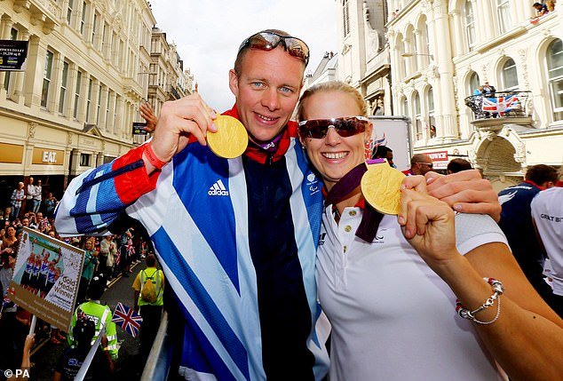 El paralímpico David Smith celebra su oro en Londres 2012 con su colega de remo del equipo GB, Naomi Riches.