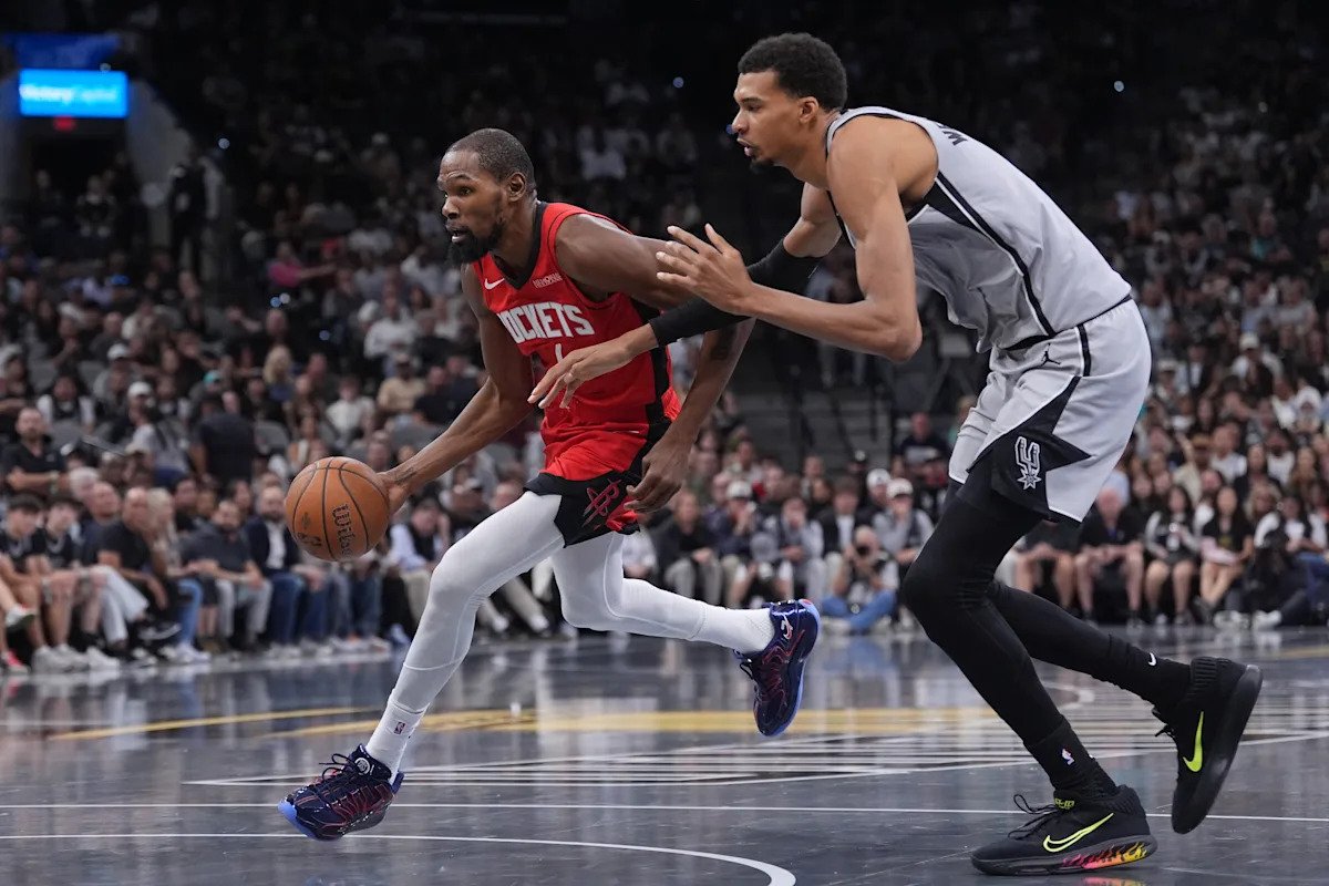 El delantero de los Houston Rockets, Kevin Durant, conduce alrededor del delantero de los San Antonio Spurs, Victor Wembanyama, durante la segunda mitad el viernes 7 de noviembre de 2025 en San Antonio. (Foto AP/Eric Gay)