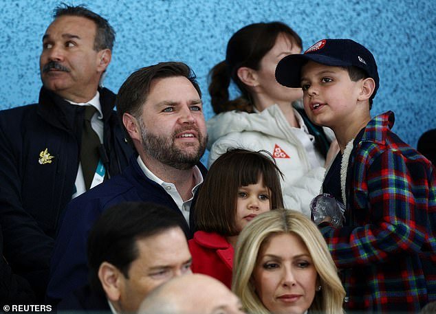 JD Vance, su esposa Usha y sus tres hijos fueron fotografiados el jueves animando al equipo femenino de hockey sobre hielo de Estados Unidos en los Juegos Olímpicos de Invierno.