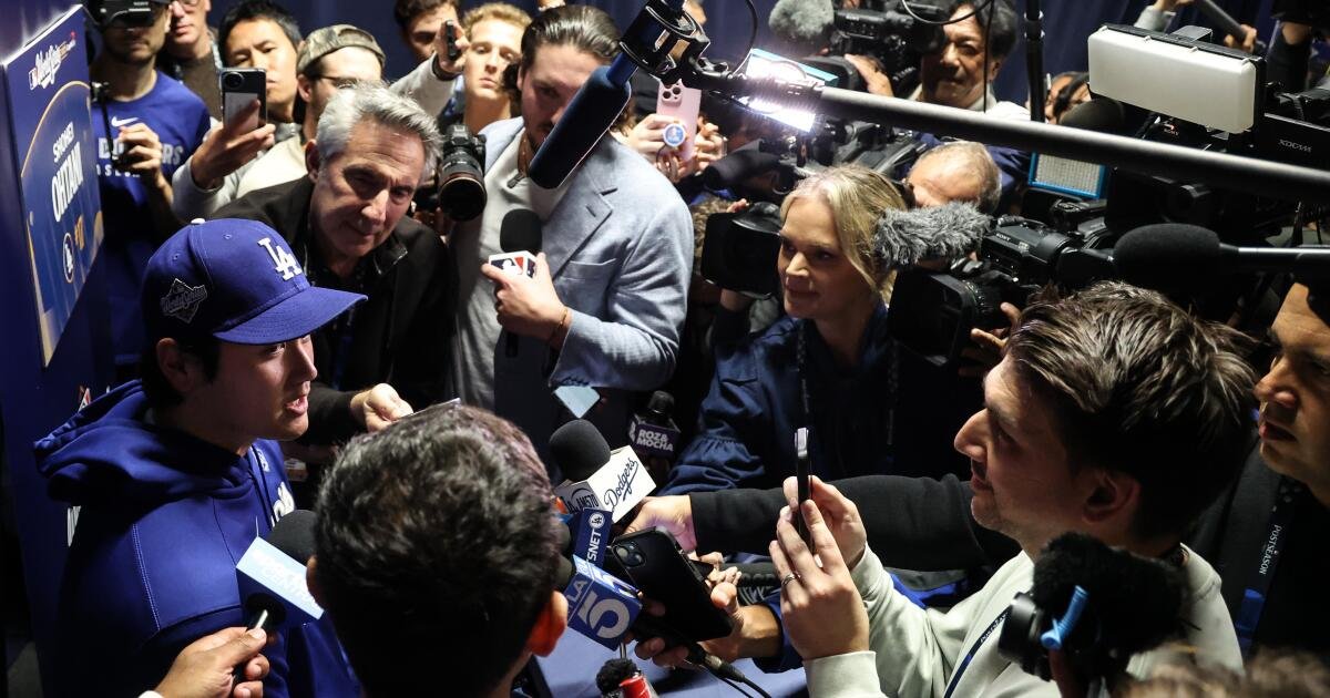 La escena del día de prensa de la Serie Mundial el jueves no fue nada inusual, desde la pared de gente frente a Shohei Ohtani hasta los micrófonos que colgaban sobre su cabeza por parte de los reporteros de televisión atrapados en la parte trasera de la manada.