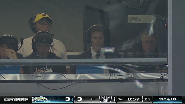 Tom Brady, parte de la parte de Fox Sports y Las Vegas Raiders, fue descubierto en un partido de fútbol el lunes por la noche entre los Raiders y el rival de la división Los Angeles Chargers con un auricular en el entrenador.