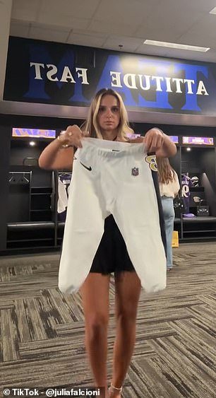 Julia Falcioni recientemente impresionó a su uniforme de su esposo Jordan Stout en la cabaña de la manta de los Ravens