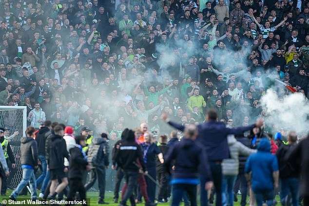 Momentos después, decenas de fanáticos de los Rangers ingresaron al campo desde la sección al final de Copland Road donde tiene su sede el grupo Ultras.