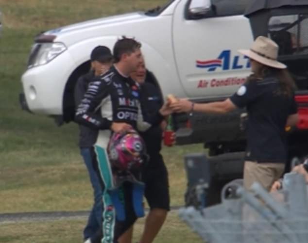 En la foto: El momento en que un fanático de las carreras le entrega al piloto de Bathurst 1000, Chaz Mostert, una cerveza fría después de que una falla en el motor arruinó su carrera el domingo.