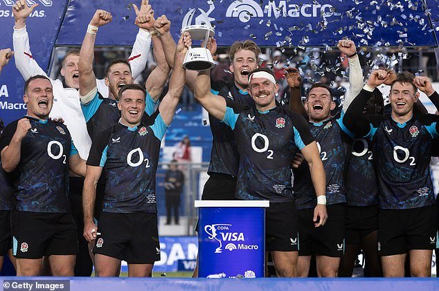 George Ford (izquierda) de Inglaterra y Luke Northmore aumentan el trofeo para celebrar una victoria por 3-0 contra Argentina en verano