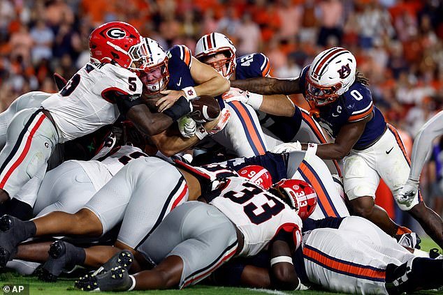 El corredor de Auburn, Jackson Arnold, pareció darle a los Tigres una ventaja de 16-0 con una carrera de touchdown de una yarda en el segundo cuarto, pero el apoyador de Georgia, CJ Allen, soltó el balón en la línea de gol con 1:32 restantes en la mitad.