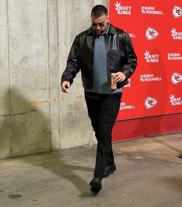 Kelce irradiaba tranquilidad mientras entraba al estadio con gafas de sol, una elegante chaqueta de cuero negra sobre una sudadera gris y pantalones negros.