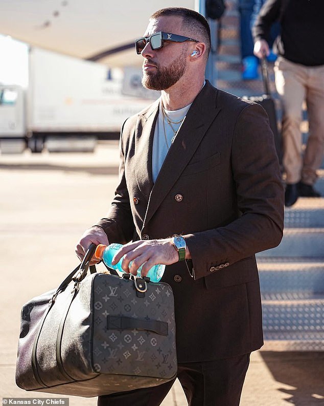 Un elegante Kelce fue visto bajando del avión con sus compañeros de equipo en Texas el miércoles por la noche. Llevaba un traje marrón cruzado con una camiseta blanca y gafas de sol Louis Vuitton negras y también sostenía una bolsa de viaje Louis Vuitton marrón.