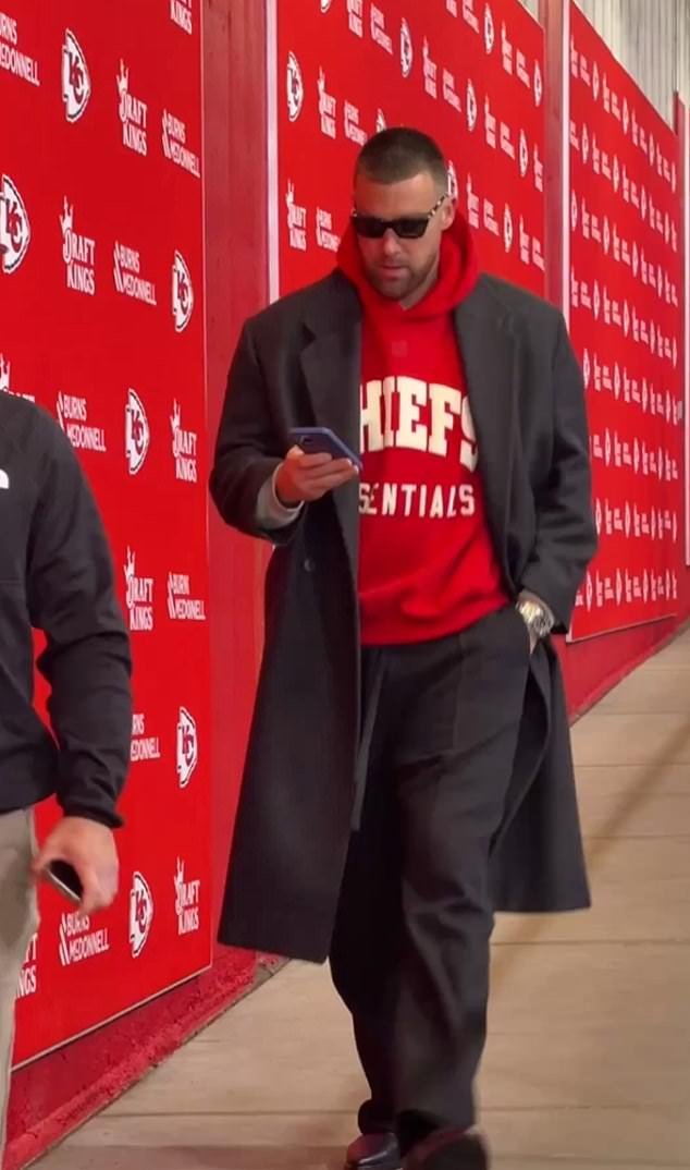 Agregó un toque de celebración vistiendo una sudadera con capucha roja de los Chiefs y levantando las solapas de su abrigo largo para revelar el nombre del equipo en el frente.