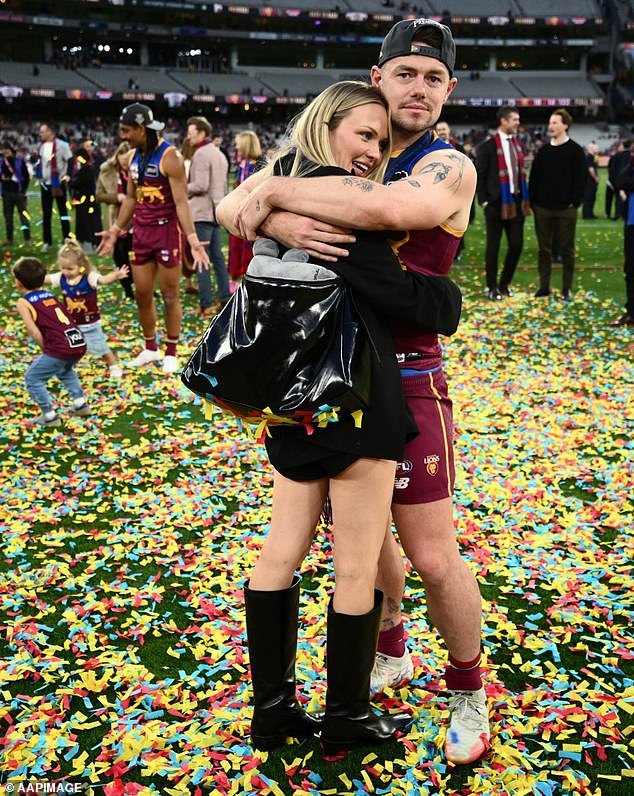Con Lachie Neale renunciando como capitán de los Lions a principios de este mes después de que su esposa Jules lo acusara públicamente de infidelidad, el club puede esperar que nadie haga preguntas más difíciles sobre su problemática “cultura” fuera del campo, escribe Lucy Manly. (En la foto: Lachie y Jules Neale celebran la victoria de los Lions sobre Geelong en el MCG en la Gran Final de la AFL del año pasado)