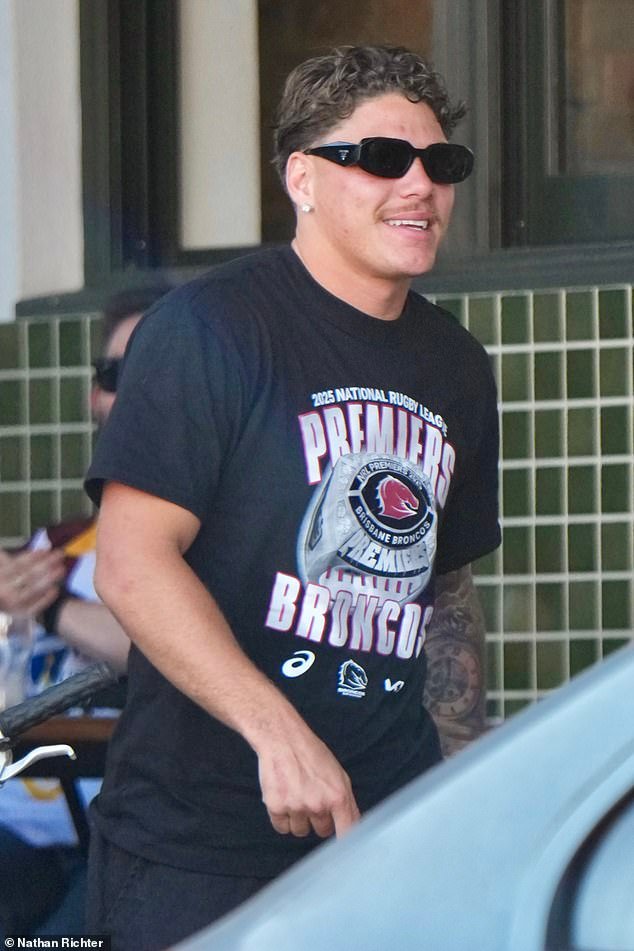 Un radiante Reece Walsh llega al Grenzstraße en Brisbanes West End cuando se transmitieron las celebraciones después de la victoria de la Premier League de Dürre NRL del club.