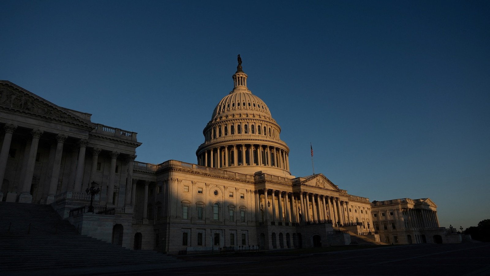 En el quinto día de un gobierno parcial de descanso en Washington, DC, EE. UU., El 5 de octubre de 2025, el sol arroja una sombra a lo largo del Capitolio de los Estados Unidos el 5 de octubre de 2025.