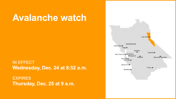 A las 8:52 a. m. del miércoles, el Servicio Meteorológico Nacional emitió una advertencia de avalancha que estuvo vigente hasta las 9 a. m. del jueves 25 de diciembre para el área metropolitana de Lake Tahoe.